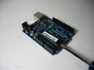 The most practical way to load your sketch is with a FTDI cable. These cables have the same FTDI USB-Serial IC that is found on a traditional Arduino with a USB port. With the cable, this IC is crammed into the plastic housing at the USB end of the cable. The other end of the cable is what you connect to the Sippino (or Prototino, DC Boarduino or Bare Bones Board etc ...) If you don’t already have one of these cables, they come in really handy any time you need to get 5 volt TTL level serial signals to and from your computer’s USB port.