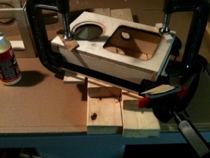 Apply and spread glue around the edge the will match up with the front. Fit the front panel onto the sides and adjust the position. Use your clamps to hold the parts tightly together. If your clamps don’t have rubber ends it is good idea to use scraps of wood to protect the box’s wood surface from damage.