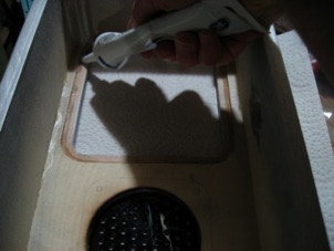 Using clear silicone clacking apply a thin bead around the rabbet that was cut in the front panel. Don’t apply too much so that it squirts out, but do make a complete bead so that the panels don’t rattle. Press the panel into the silicone being sure that it is upside right! Repeat for the speaker grill, but from the outside of the box.