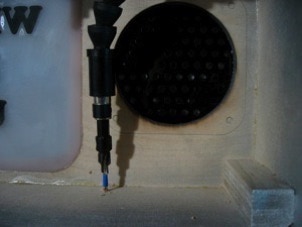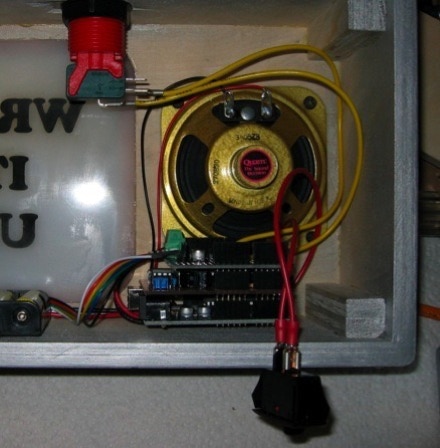Using your Arduino as a guide, mark two spots for the mounting screws. Choose a spot that won’t cast a shadow on the front message panel and make sure that the stack of Arduino, ShiftBrite shield and VoiceShield won’t get in the way of the speaker.