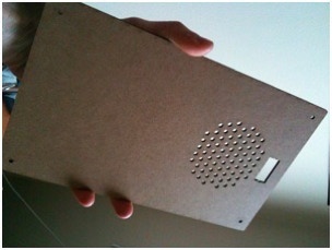 The back panel is simply a rectangle of 1/8” hardboard. We used this Back Panel.pdf to cut it out on the laser. Any backing should do, here I added holes behind the speaker because it seemed like it would help let the sound out. The button hole was made for the button we had on hand, so if you use this file, you will probably have to edit it a bit.