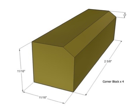 Make four corner supports to match the following illustration. The bevel edge can be made by simply sanding. These are non critical dimensions but the length should be the same on all four, since they are used to hold the back in place.